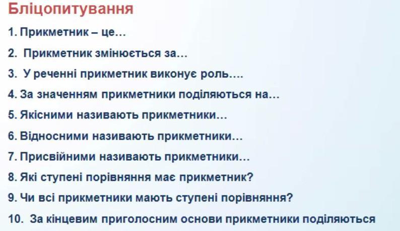 )Прикметник -це самостійна частина мови, що виражає ознаку предмета, граматично виявлену в категоріях роду, числа і відмінка та відповідає на питання який? яка? яке? які? чий? чия? чиє? чиї?