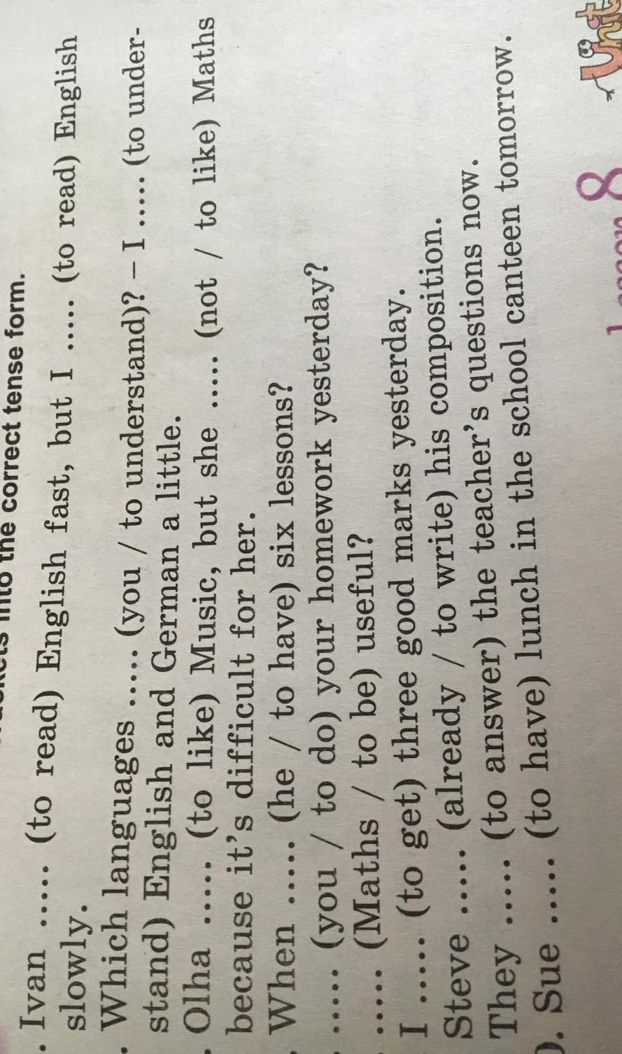 Olha likes Music but she doesn't like Maths because...When does he have six lessons? Did you do your homework yesterday? Is Maths useful? I got three good marks yesterday. Steve has already written his composition.