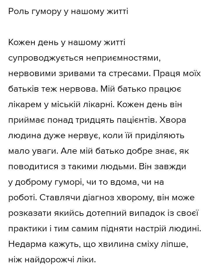 Моя мати працює в лікарні. Кожного дня вона приймає десятки пацієнтів. Дуже часто люди нервують і хвилюються, але мати знає: як поводитись у таких випадках. Вона завжди в доброму гуморі, чи то вдома, чи на роботі. Ставлячи діагноз хворому, вона може розповісти якийсь дотепний випадок зі своєї практики й цим підняти настрій людині. А інколи достатньо просто привітно заговорити і посміхнутися, щоб людина уже відчула себе важливою й потрібною.