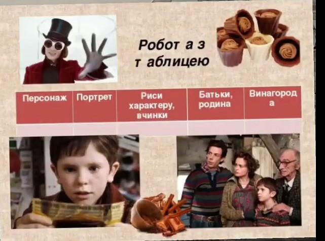 Персонаж - Чарлі. Портрет - коричневе волосся, малий на зріст, коричневі очі. Риси характеру, вдача - дуже добрий, чесний і хороший хлопчик. Батьки, родина - Батько Мати дві діди і дві баби і сам Чарлі. Винагорода - Шоколадна фабрика Вонко.