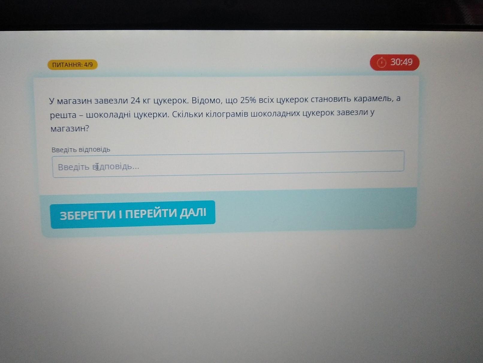 У магазин завезли 24 кг цукерок. Відомо, що 25% всіх цукерок становить карамель, а решта - шоколадні цукерки. Скільки кілограмів шоколадних цукерок завезли у магазин?
