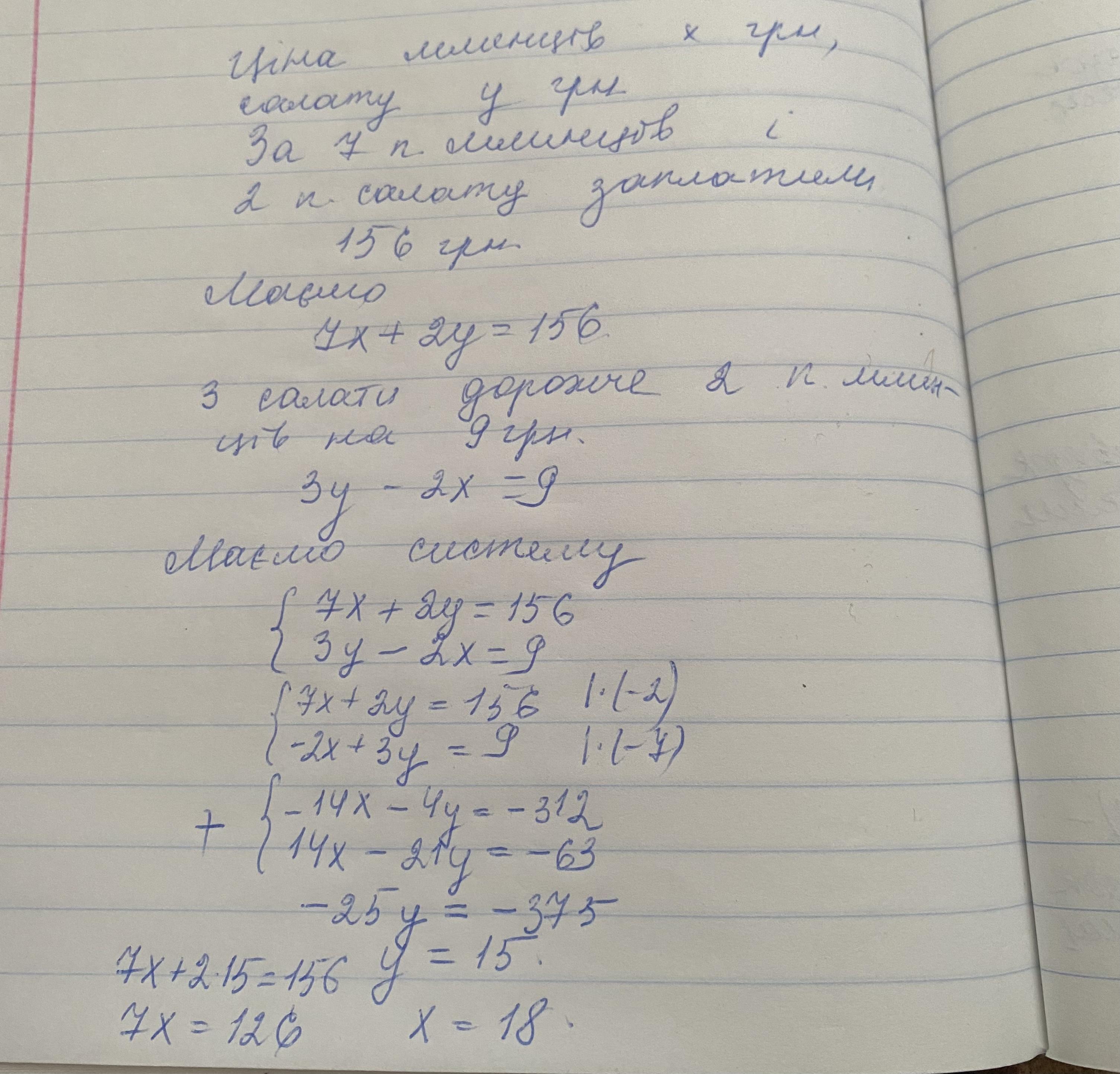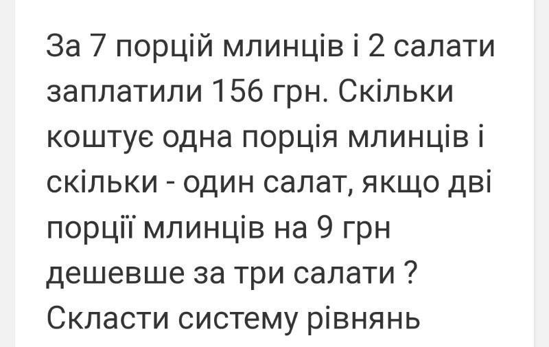 Ціна салату 15 грн, ціна млинців 18 грн. Розв’язання на фото