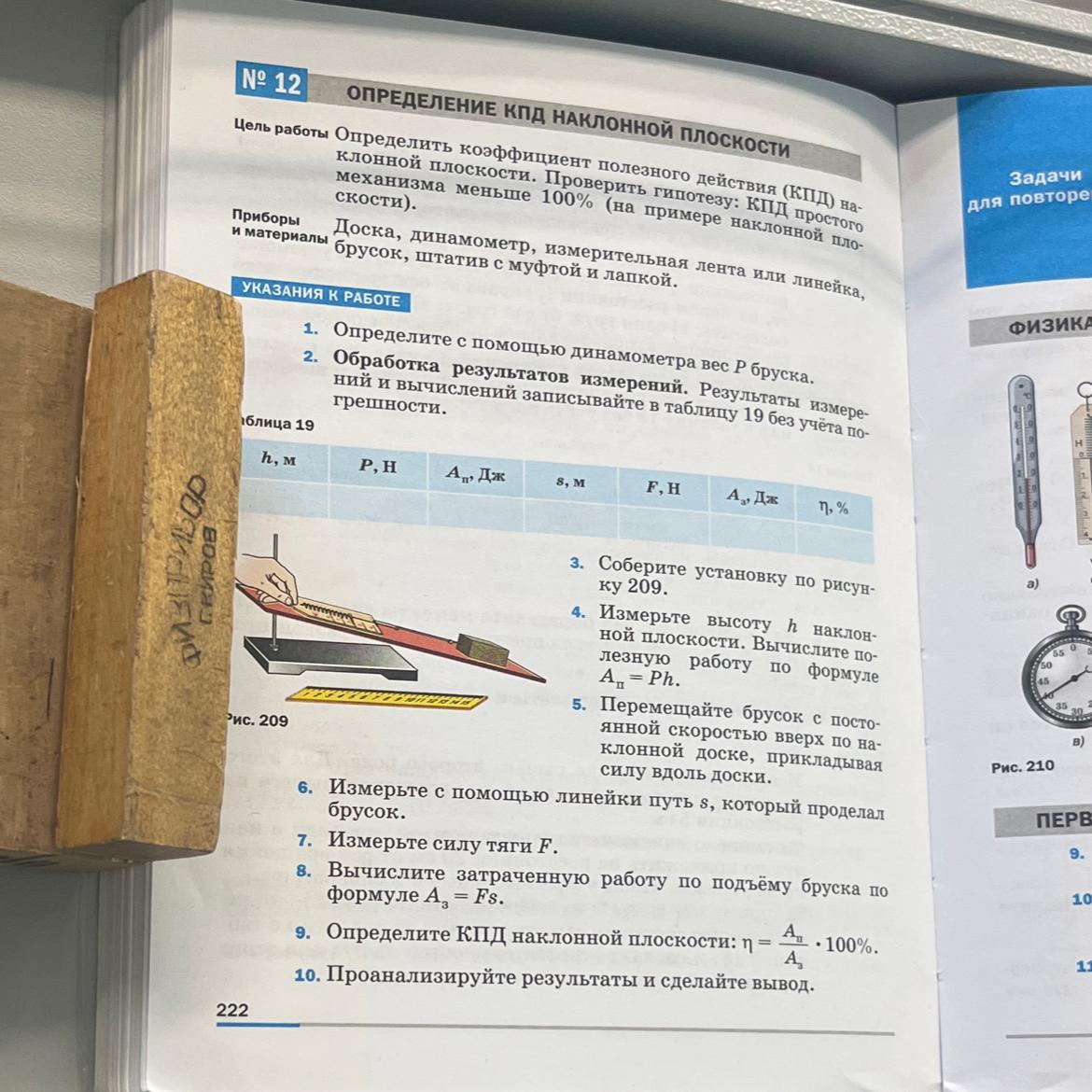 и материалы брусок, штатив с муфтой и лапкой.