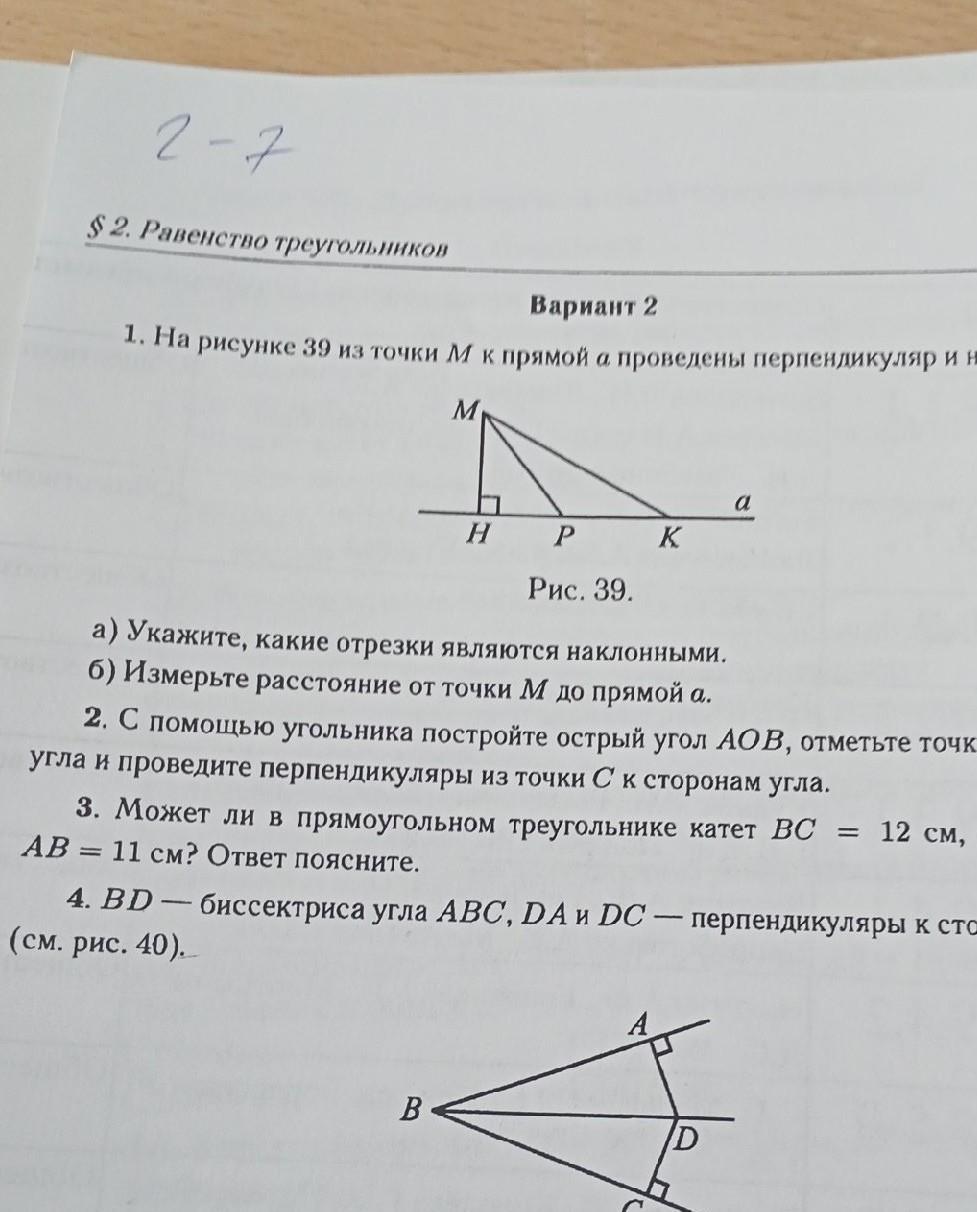 1. На рисунке 39 из точки М к прямой а провелены перпенликуляр и наклоные.