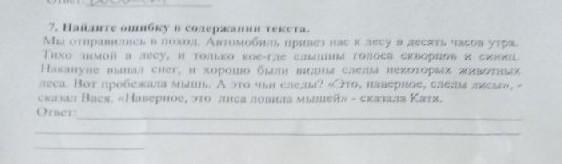 7. Найдите ошибку и содержании тексти, Мы отправились в поход, Автомобил, прине пае к лесу и десят, часов утра Тихо зимой в лесу, и только кое-где слышны голоса скворцов и си Накануне выпал снег, и хорошо были дни след некоторых животных лее. Вот пробежала мышь. А это ни следі? «Это, наверное, следы сы», сказал Васи, «Наверное, это не ловила матегі», - сказала Кати, Ornet: