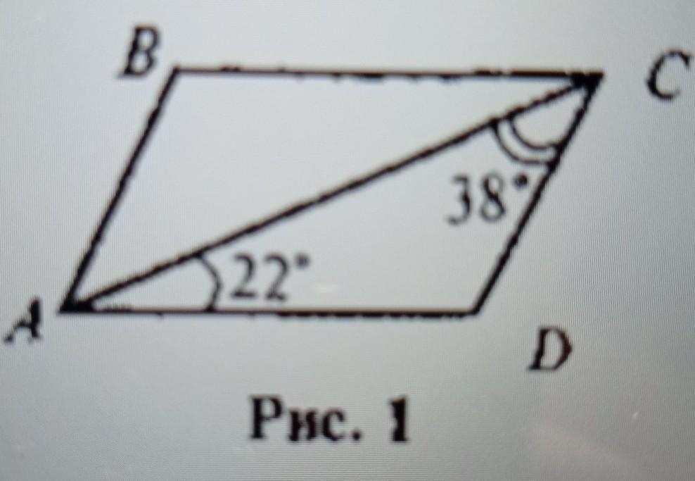 Обьяснение:паралелограм поделили на два треугольника с общей основой сума углов остроугольного треугольника 180 градусов 180-(38+22)=120