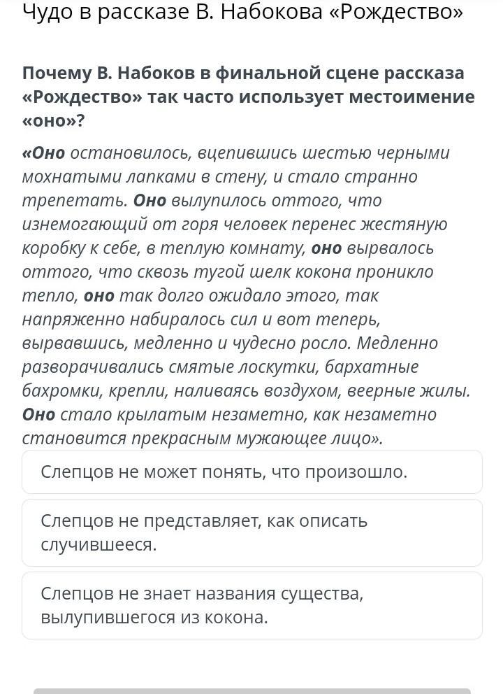 Чудо в рассказе В. Набокова «Рождество» Почему В. Набоков в финальной сцене рассказа «Рождество» так часто использует местоимение «оно»? «Оно остановилось, вцепившись шестью черными мохнатыми лапками в стену, и стало странно трепетать. Оно вылупилось оттого, что изнемогающий от горя человек перенес жестяную коробку к себе, в теплую комнату, оно вырвалось оттого, что сквозь тугой шелк кокона проникло тепло, оно так долго ожидало этого, так напряженно набиралось сил и вот теперь, вырвавшись, медленно и чудесно росло. Медленно разворачивались смятые лоскутки, бархатные бахромки, крепли, наливаясь воздухом, веерные жилы. Оно стало крылатым незаметно, как незаметно становится прекрасным мужающее лицо». Слепцов не может понять, что произошло. Слепцов не представляет, как описать случившееся. Слепцов не знает названия существа, вылупившегося из кокона. Назад Проверить