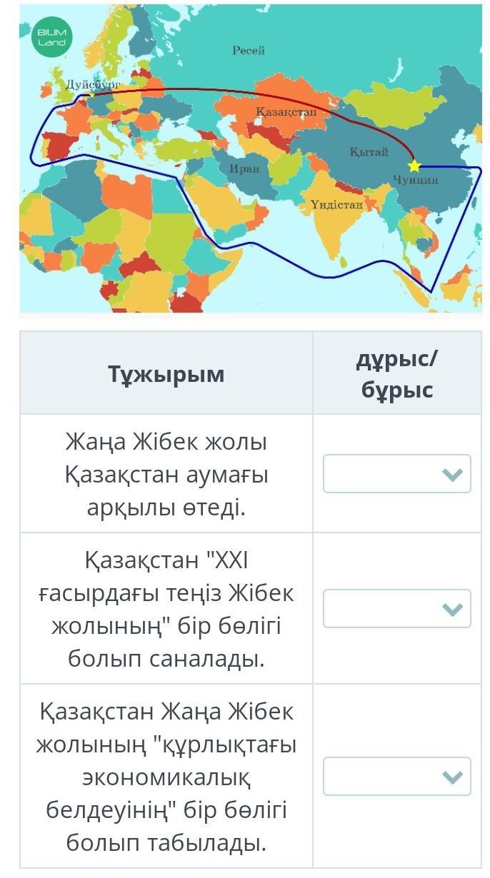 "Жаңа Жібек жолының" сызбасына қара.Дұрыс және бұрыс тұжырымдарды анықта.