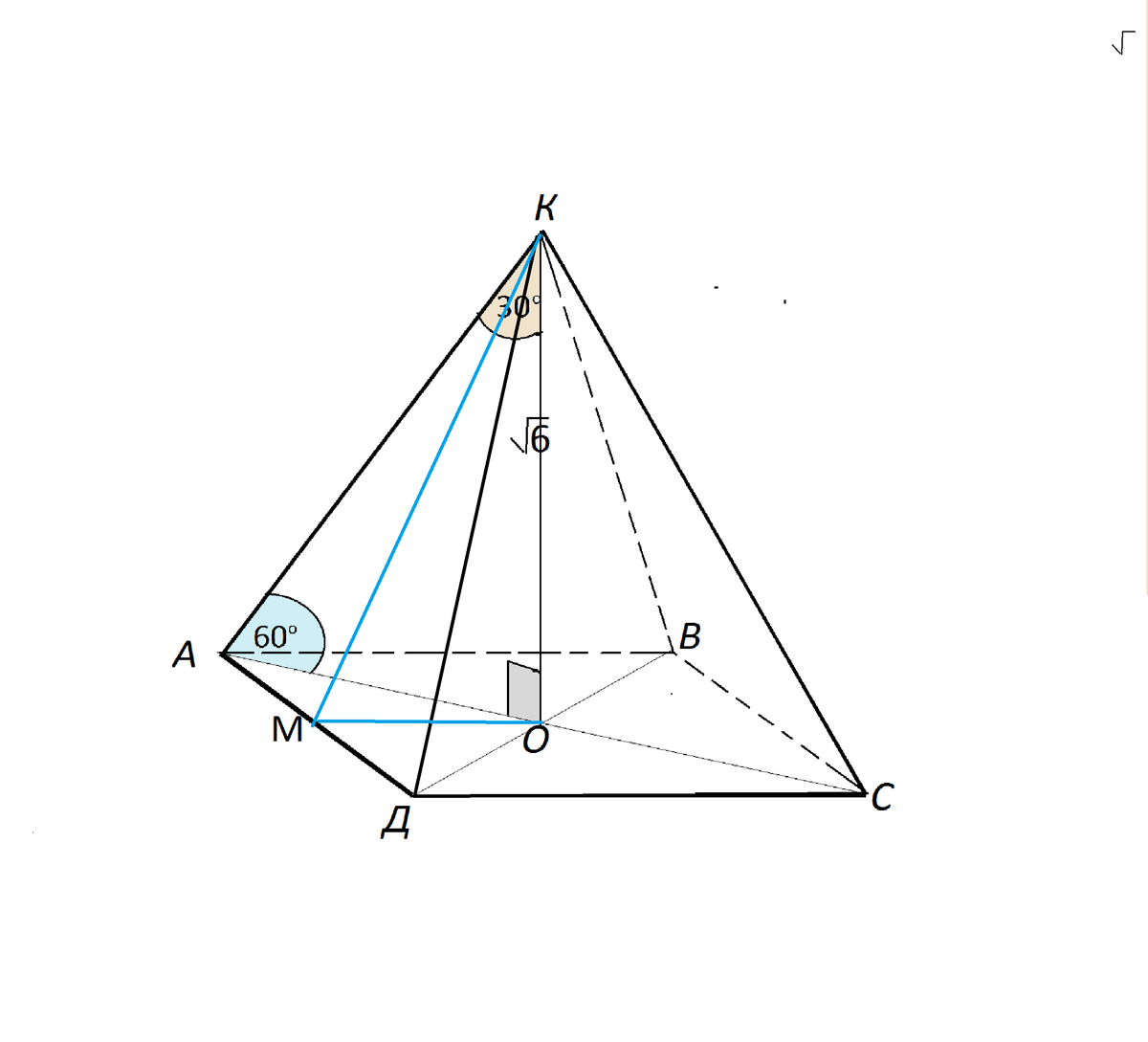 Высота правильной четырехугольной пирамиды равна √6 см, а боковое ребро наклонено к плоскости основания под углом 60 градусов.