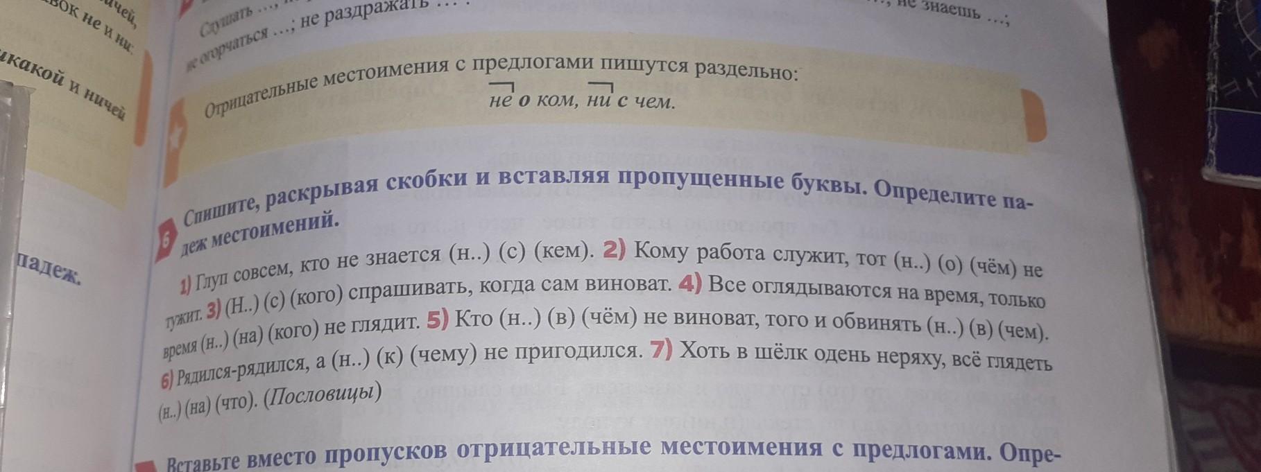 1. Ни с кем, 1спр.. 2.Не о чём 2спр.. 3. Не с кого 1спр.. 4. Ни на кого 1спр.. 5.Ни в чём 2спр.. 6. Ни к чему 2спр.. 7.Не на что 1спр..