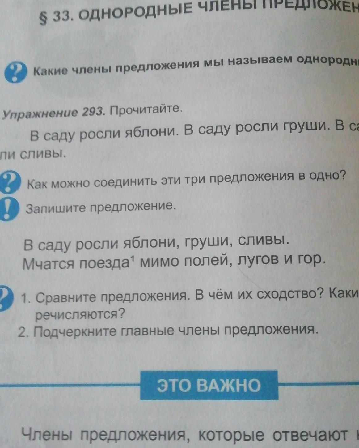 Упражнение 293. Прочитайте. В саду росли яблони. В саду росли груши. В саду рос- ЛИ СЛИВЫ. ? Как можно соединить эти три предложения в одно? Запишите предложение. В саду росли яблони, груши, сливы. Mчатся поезда мимо полей, лугов и гор. 21. Сравните предложения. В чём их сходство? Какие слова не речисляются? 2. Подчеркните главные члены предложениях. Пожалуйста умоляю с заданиями даю 20 баллов пожалуйста умоляю мне срочно нужно