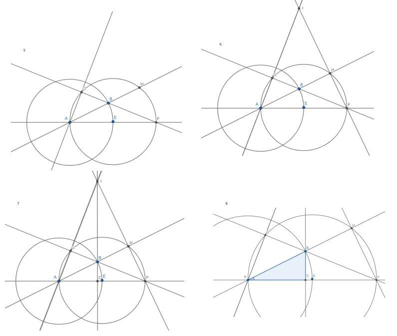 1) Построение с помощью циркуля и линейки по этапам представлено на приложенных рисунках. Прокомментирую 7 картинку, почему угол BCA является прямым: в окружности с центром в точке Е и радиусом EA треугольники AGF, AHF являются прямоугольными, как вписанные в окружность треугольники, с одной стороной, являющейся диаметром окружности - соответственно тогда FG и AH являются высотами AIF, и точка B является точкой пересечения высот этого треугольника - значит прямая IB также будет являться высотой в треугольника AIF -значит BC⊥CA