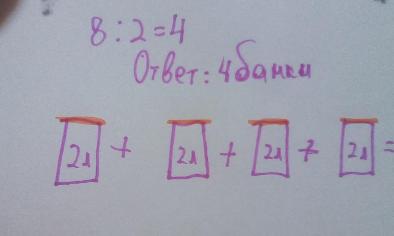 Сварили 8л компота и разлили в двухлетровые банки сколько банок потребовалось сделай к задаче схематический чертеж абразец