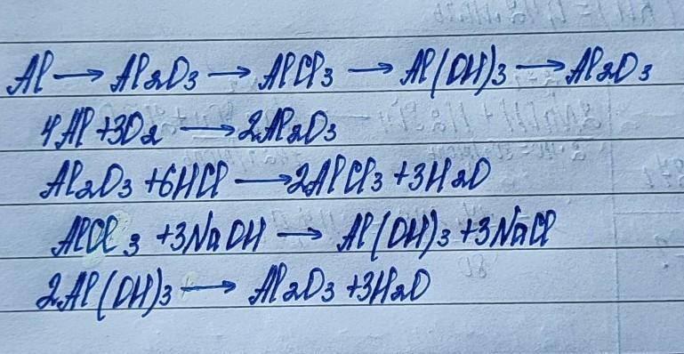 Запишите уравнения, с помощью которых можно осуществить следующие превращения: Al Al2O3 AlCl3 Al(OH)3 Al2O3