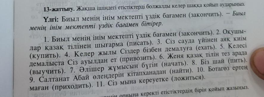 2 . оқушылар қазақ тілінде шығарма жазды. 3. сіз сауда үйіне ақ киім сатып алдыңыз. 4. келер жылы Сіз бізбен демалуға барасыздар. 5. Келесі демалыста Сіз ауылдан ет алып кетесіз. 6. женя қазақ тілн тез арада жатады. 7. Әлішер жұмысын бүгін бастайды. 8. біз шай ішеміз. 9. Салтанат Абай өлеңдерін кітапханадан табады. 10. Ботакөз ертең маған келеді. 11. Сіз мына кереуітке жаныңыз