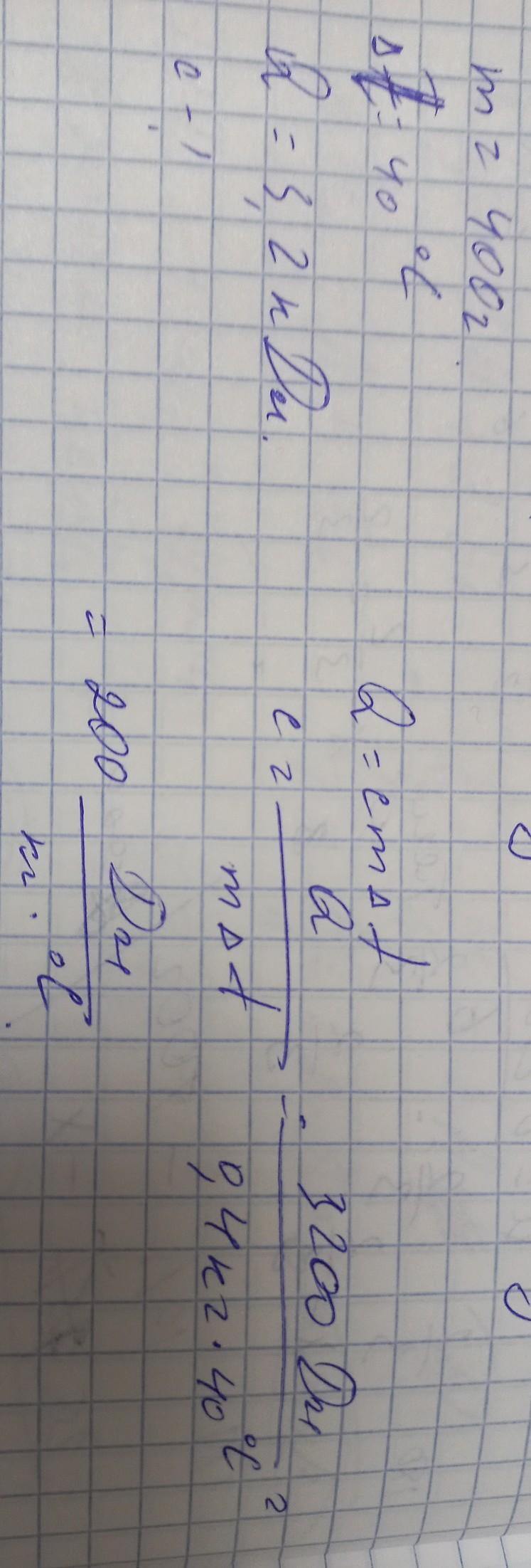 Чему равна удельная теплоемкость вещества 400г, если при его охлаждении на 40градусов выделяется 3,2кДж тепла