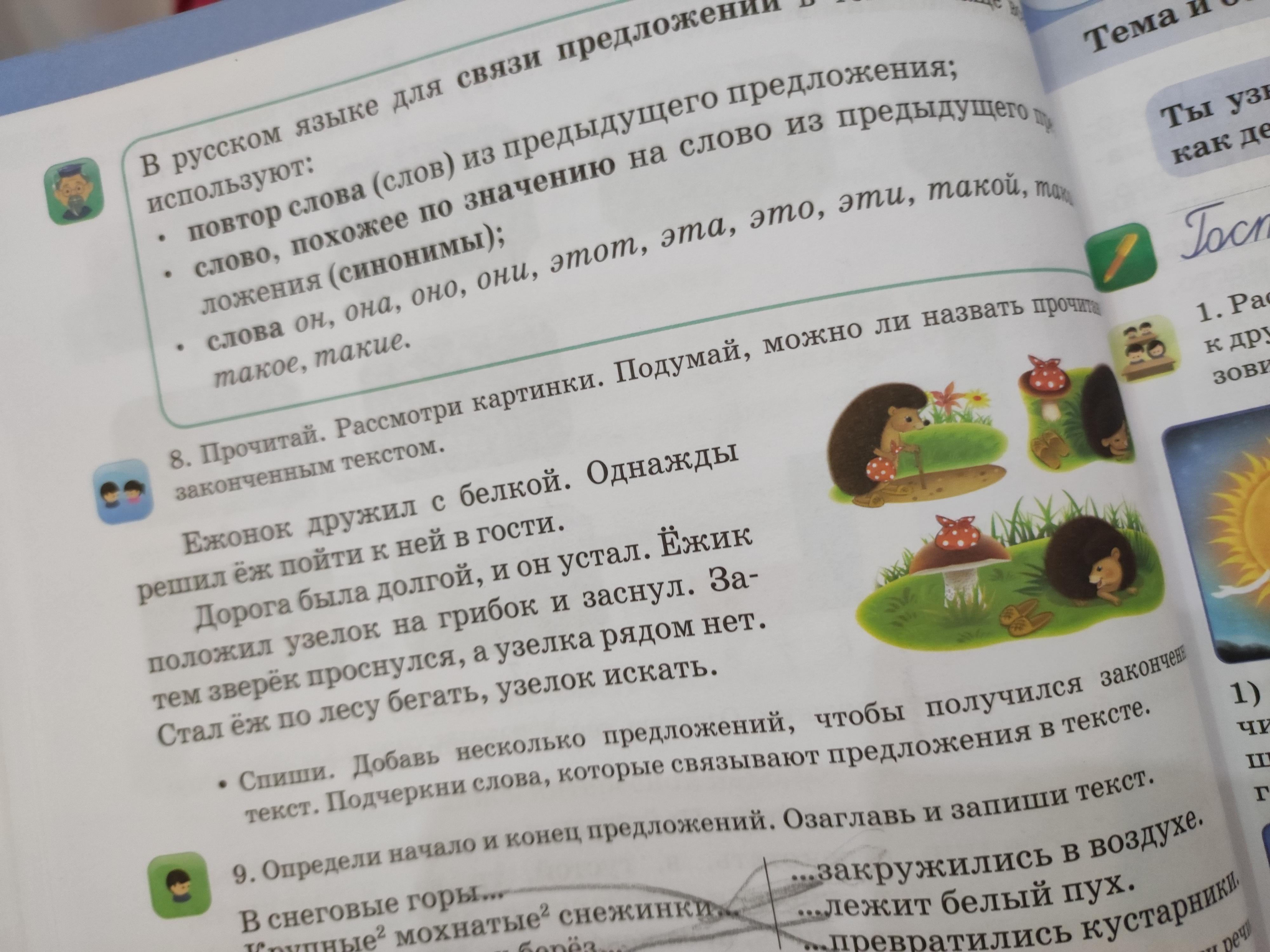 Ищет нигде нет узелка,смотрит за гриб,узелок за ним лежит,взял ёжик узелок и дальше пошёл к белке в гости
