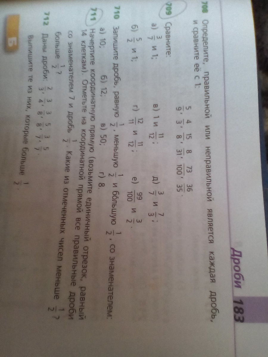 а) 3/7 < 1. б) 5/2>1. в)1>11/12. г)12/11>11/12. д) 3/7<7/3