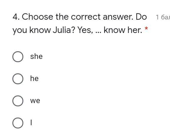 1 балл 4. Choose the correct answer. Do you know Julia? Yes, ... know her. O she O he O we O