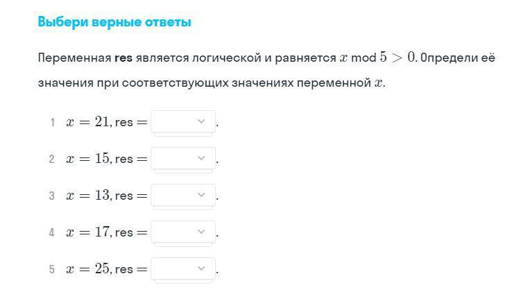 3. x = 13, а значит 13 mod 5 > 0, т.к 13 не делится на 5 без остатка. Поэтому Res примет значение True.
