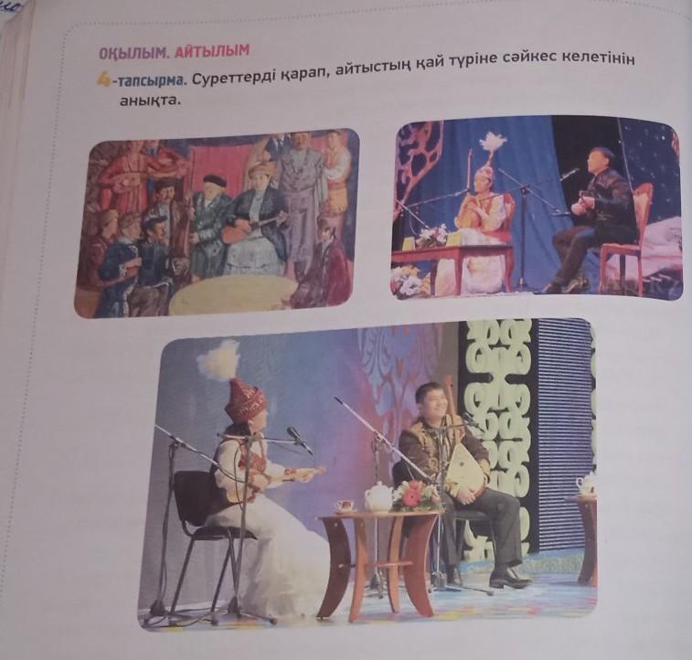 Оқылым. Айтылым 4-тапсырма. Суреттерді қарап, айтыстың қай түріне сәйкес келетінін анықта.