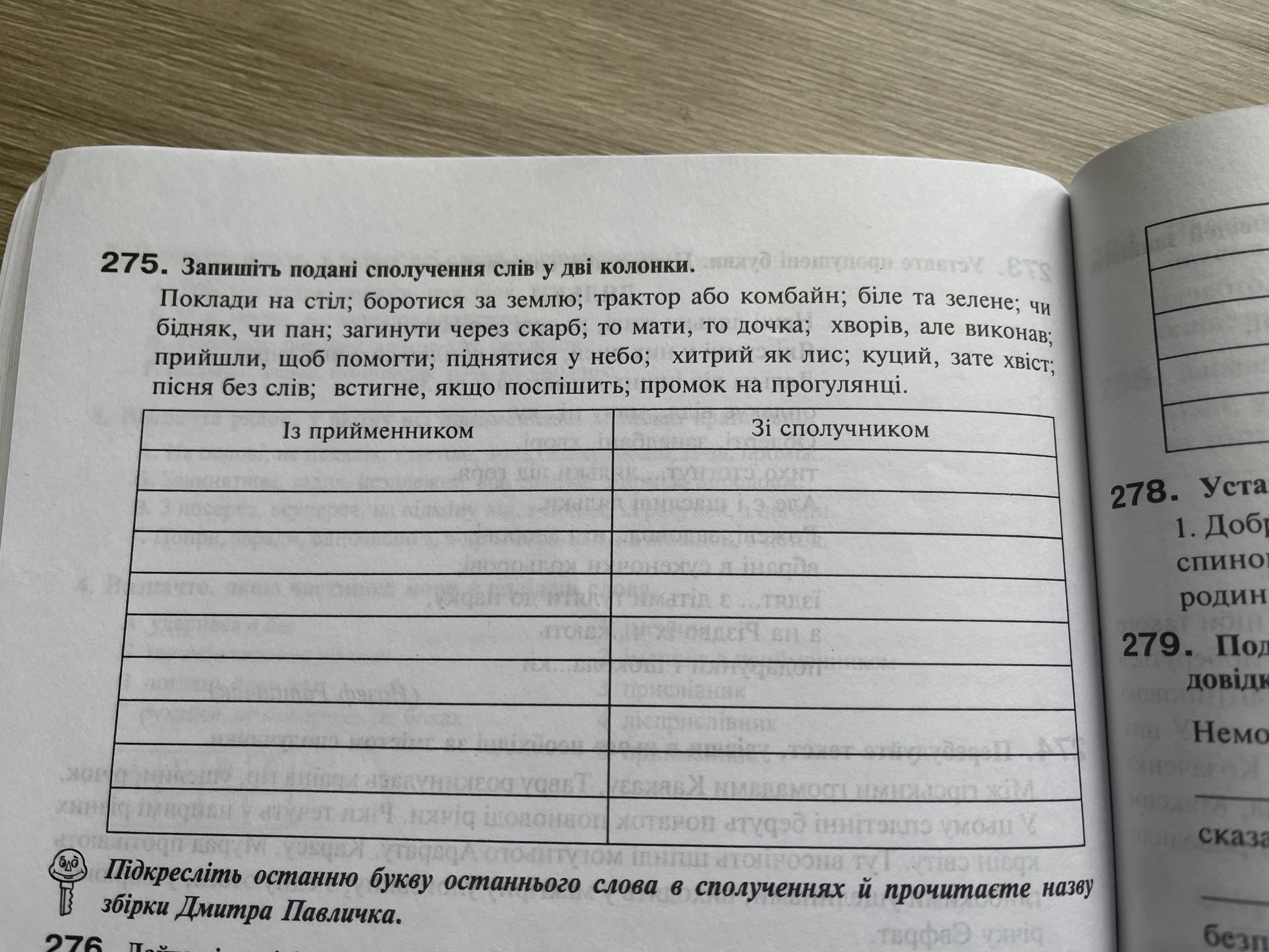 Iз прийменником: поклади на стiл; трактор або комбайн;бiле та зелене;загинути через скарб; пiднятися у небо:куций,зате хвiст; встигне,якщо поспiшить