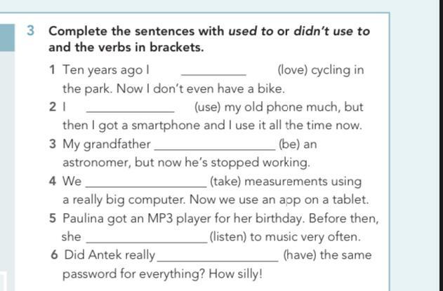 1.used to love 2.didn't use 3.used to be 4.used to take 5.used to listen 6.used to have