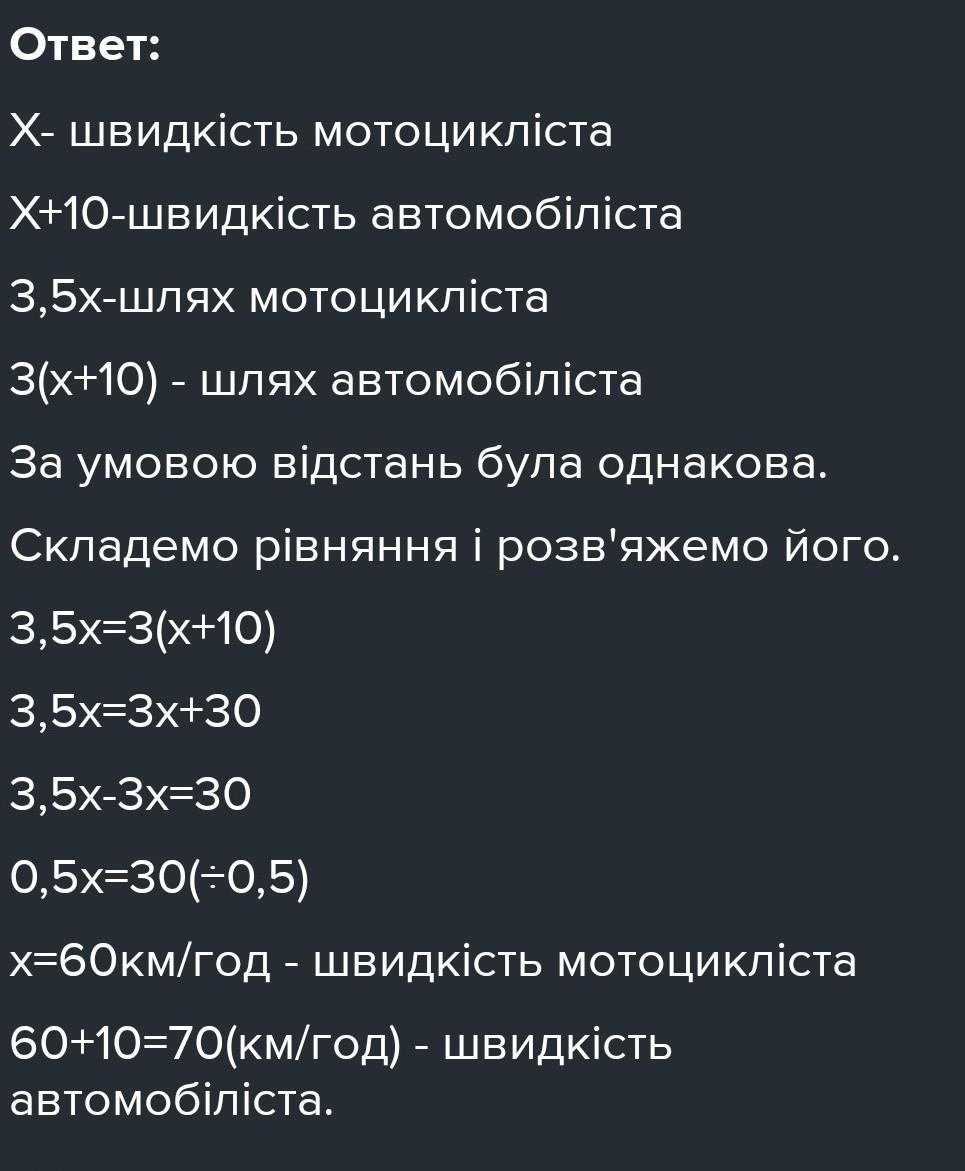Мотоцикліст проїхав певну відстань за 3,5 год, а автомобіліст, швидкість якого на 10 км/год більше, проїхав цю відстань за 3 год. З якою швидкістю рухався автомобіліст?