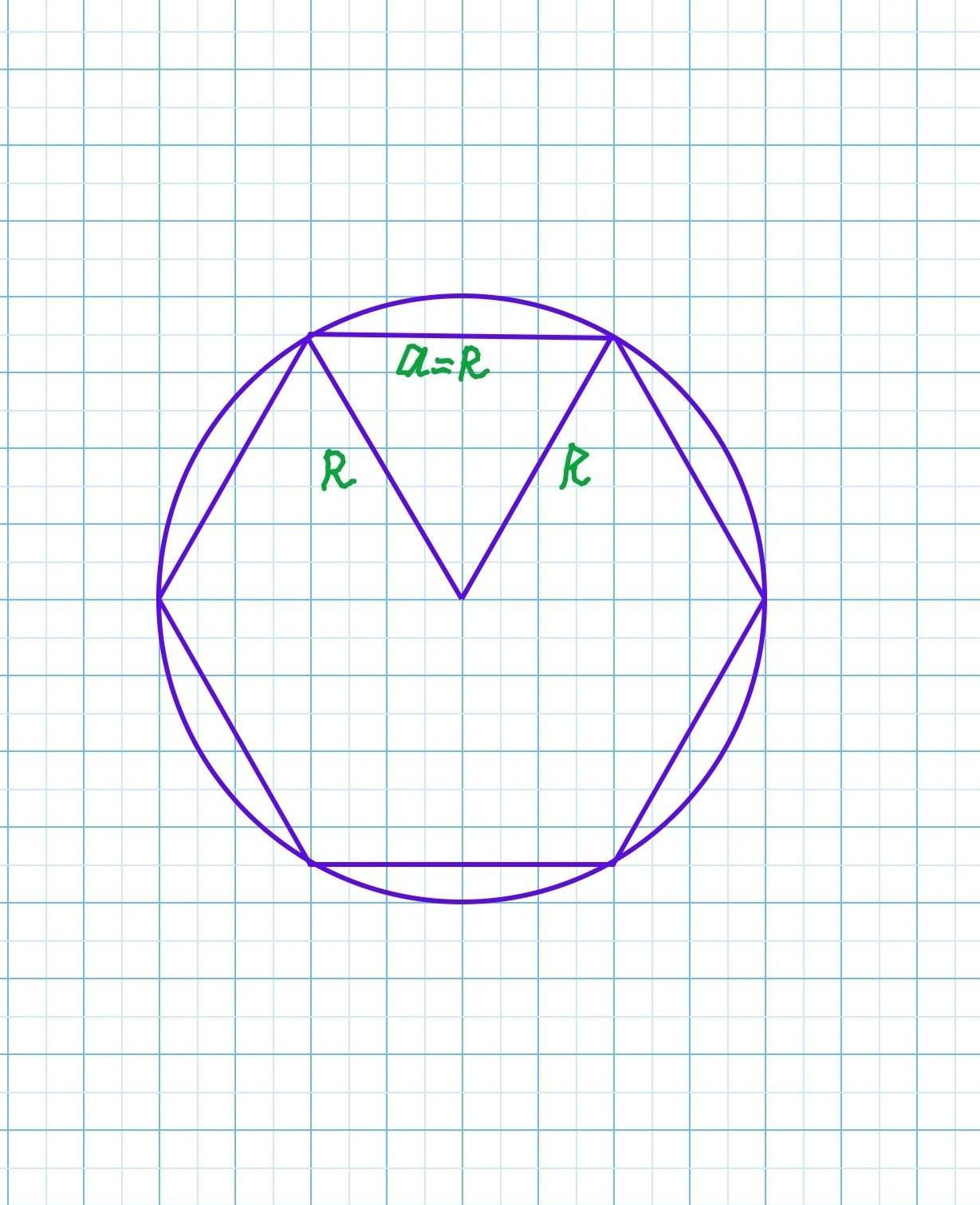 Радиус правильного шестиугольника равен стороне шестиугольника: R=a.