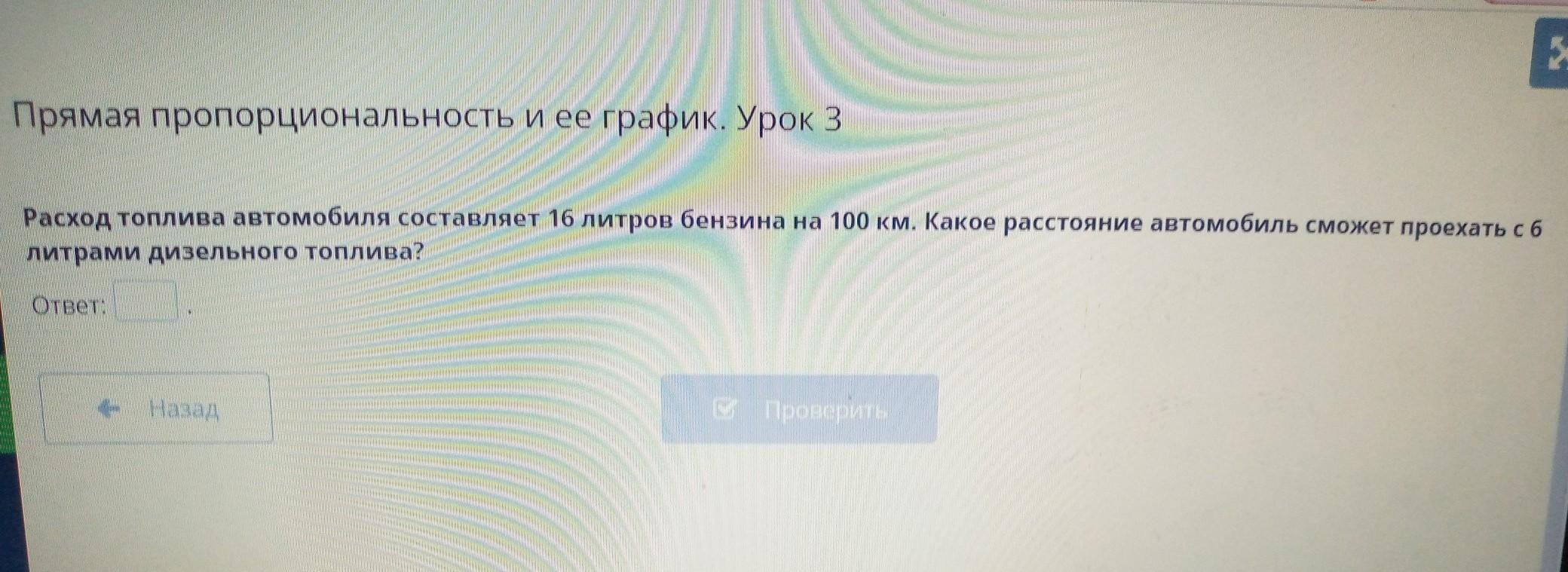 Прямая пропорциональность и ее график. Урок 3 Расход топлива автомобиля составляет 16 литров бензина на 100 км. Какое расстояние автомобиль сможет проехать сб литрами дизельного топлива? Ответ: - Назад С Проверить