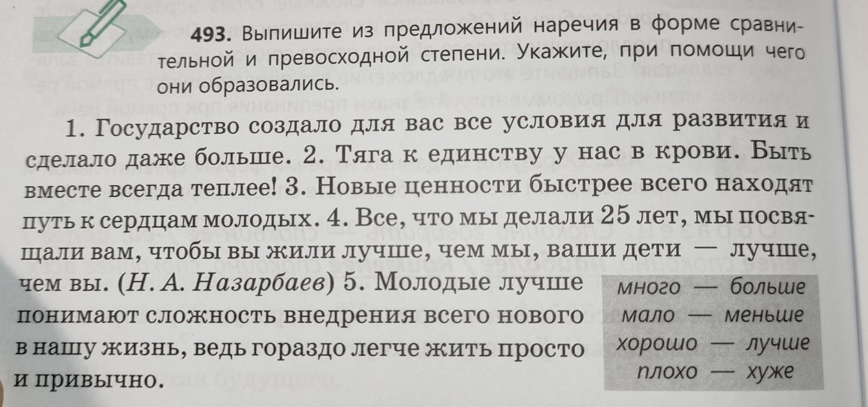 I 493. Выпишите из предложений наречия в форме сравни тельной и превосходной степени. Укажите, при помощи чего они образовались. 1. Государство создало для вас все условия для развития и сделало даже больше. 2. Тяга к единству у нас в крови. Быть вместе всегда теплее! 3. Новые ценности быстрее всего находят путь к сердцам молодых. 4. Все, что мы делали 25 лет, мы посвя- щали вам, чтобы вы жили лучше, чем мы, ваши дети лучше, чем вы. (Н. А. Назарбаев) 5. Молодые лучше Много больше понимают сложность внедрения всего нового мало меньше в нашу жизнь, ведь гораздо легче жить просто хорошо лучше плохо и привычно.