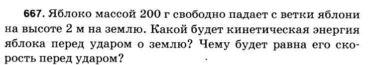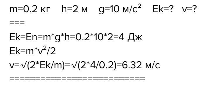 Яблоко массой 200 грамм свободно падает с ветки яблони на высоте 2 м на землю. Какой будет кинетическая энергия яблока перед ударом о землю? Чему будет равна его скорость перед ударом?