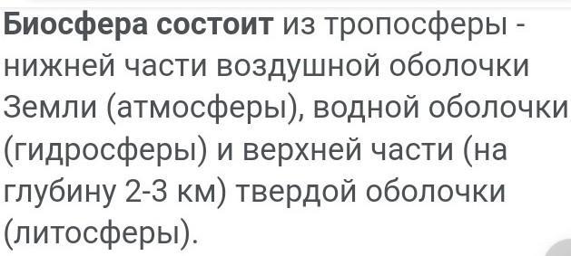 1.Биосфера состоит из тропосферы - нижней части воздушной оболочки Земли (атмосферы), водной оболочки (гидросферы) и верхней части (на глубину 2-3 км) твердой оболочки (литосферы).