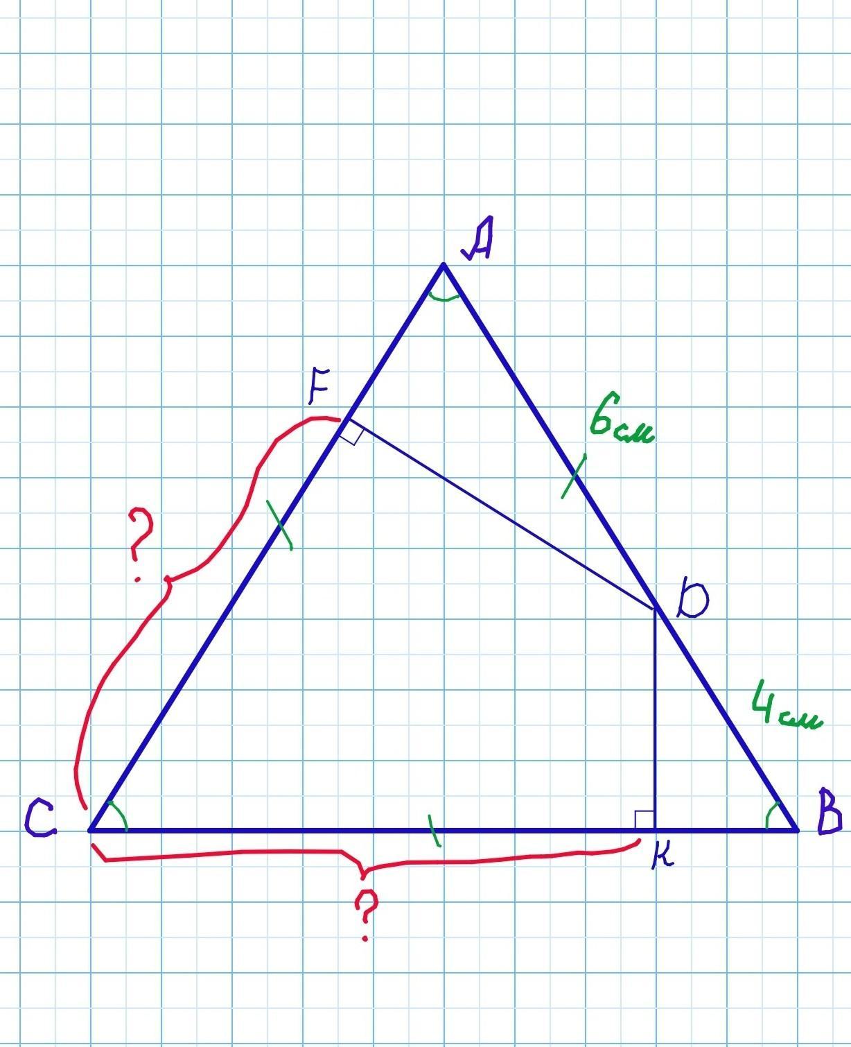 BD=4см, AD=6см. DK⟂BC, FD⟂AC.