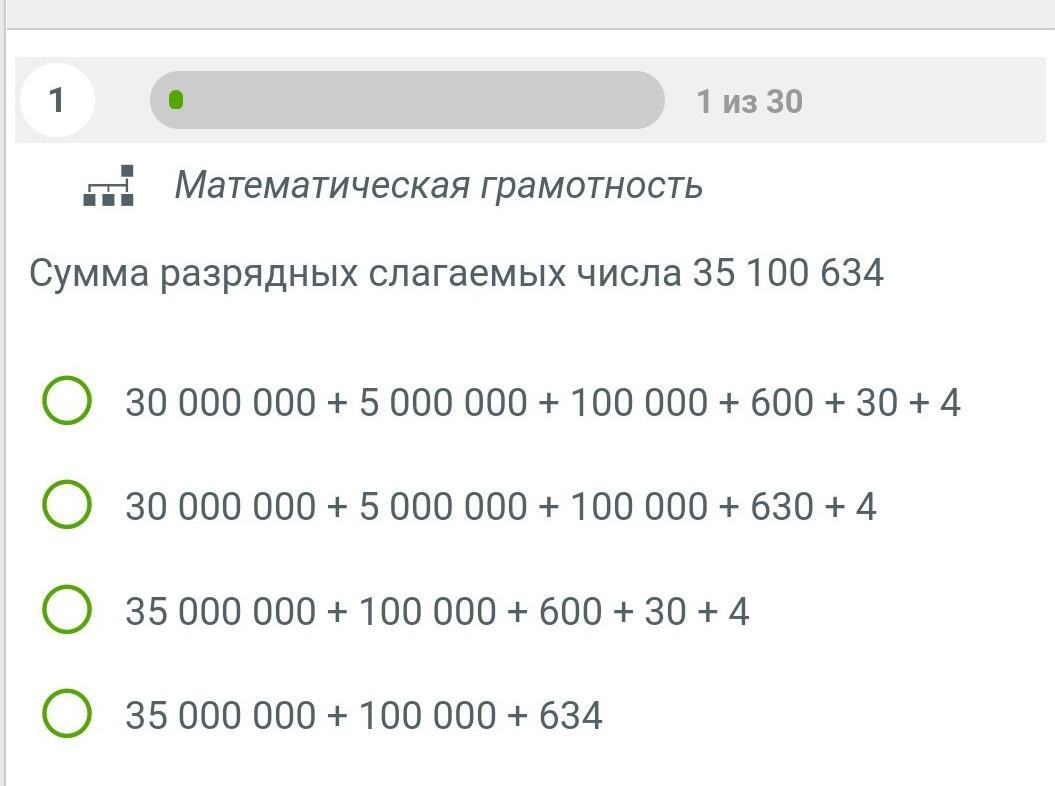1 1 из 30 Математическая грамотность ОО Сумма разрядных слагаемых числа 35 100 634 30 000 000 + 5 000 000 + 100 000 + 600 + 30 + 4 30 000 000 + 5 000 000 + 100 000 + 630 + 4 35 000 000 + 100 000 + 600 + 30 + 4 35 000 000 + 100 000 + 634
