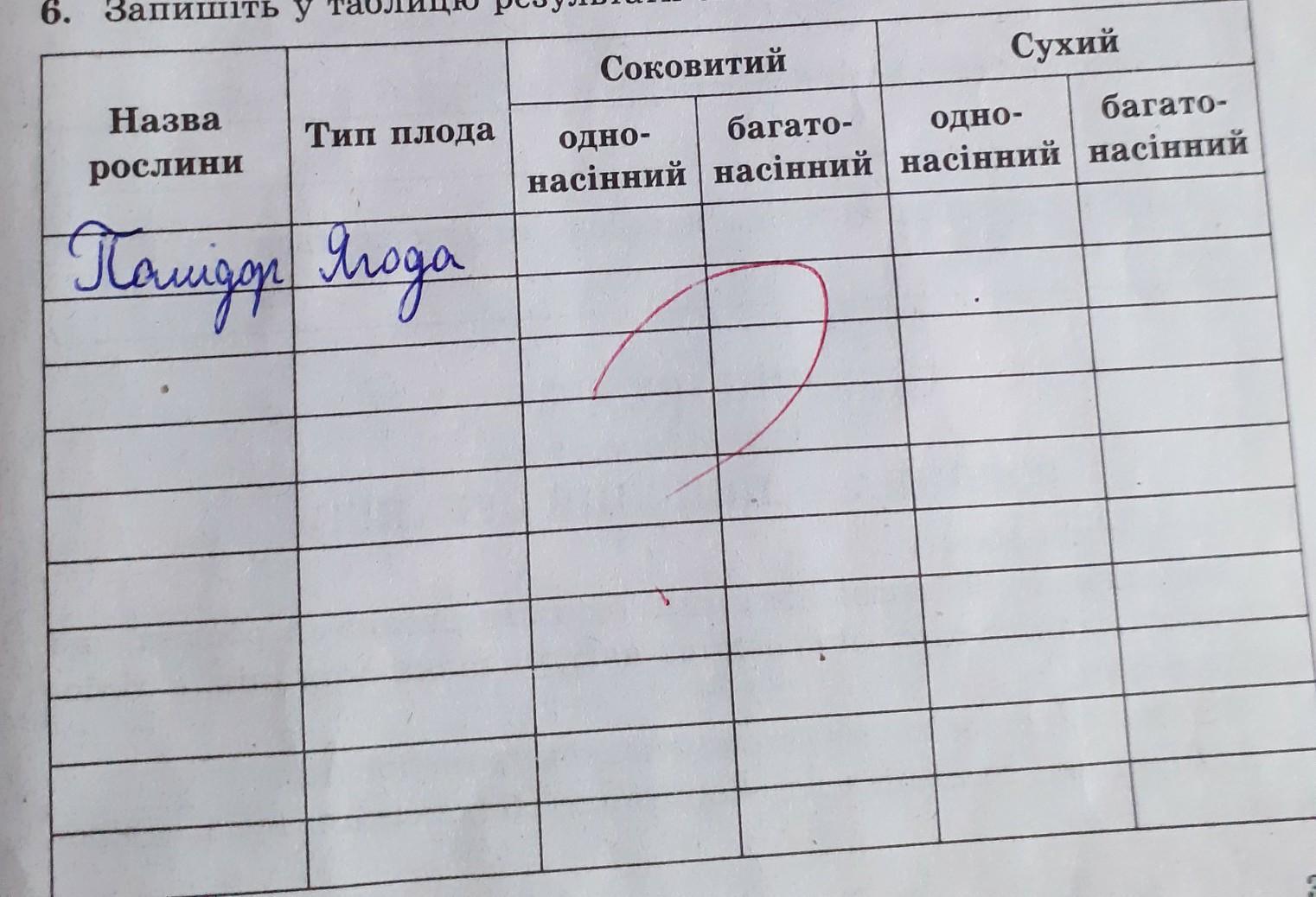 потрібно писати рослину, а потім його плід. далі обрати який плід сухий чи соковитий, одно-насінний чи багато-насінний( написати у одній з 2 рамок + там де думаєте, що є вірним)
