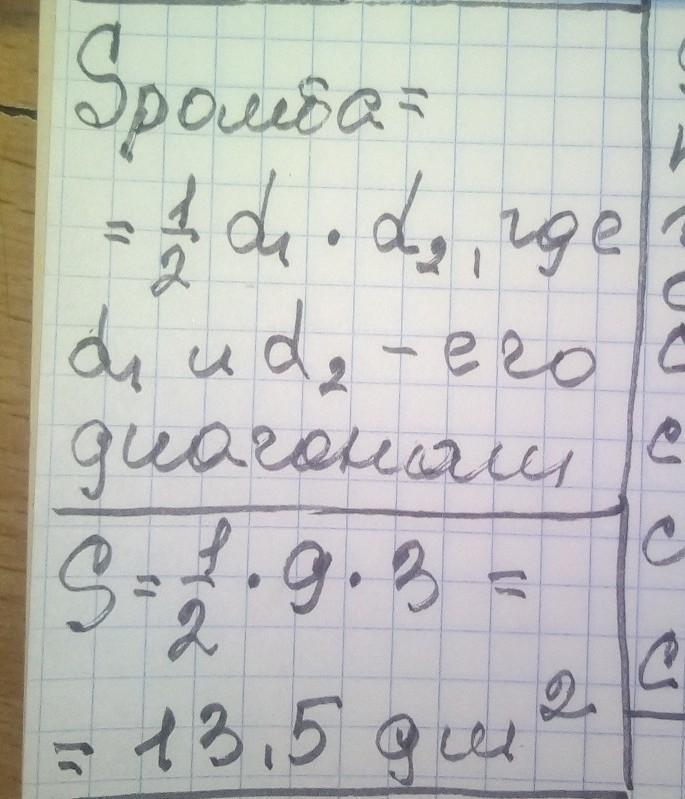 Вычисли площадь ромба, если одна его диагональ равна 9 дм , а вторая диагональ равна 3 дм .