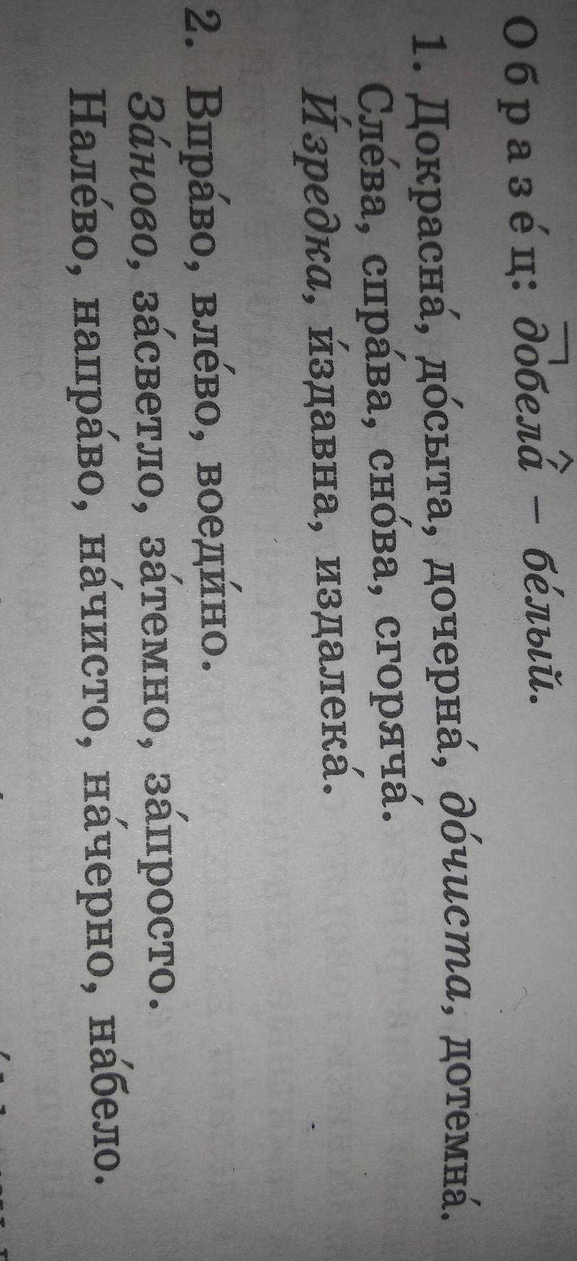 Докрасна-красный, досыта-сытый, дочерна-черный, дочиста-чистый, дотемна-темный, слева-левый, справа-правый,снова-новый, сгоряча-горячий, изредка-редкий, издалека-далекий.