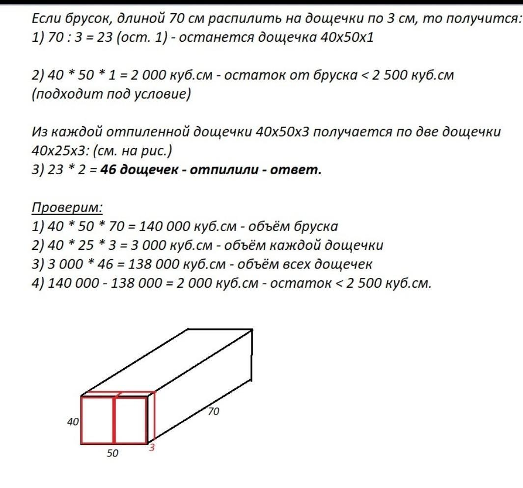 От деревянного бруска размером 40см x 50см x 70см отпилили несколько дощечек размером 3см x 40см x 50см. После этого остался брусок объёмом менее 2200см^3. Сколько дощечек отпилили?
