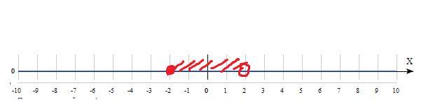 обьединяем решения в общее -2 <=x<2 ; х є [-2;2) (почему-то не могу поправить решение)