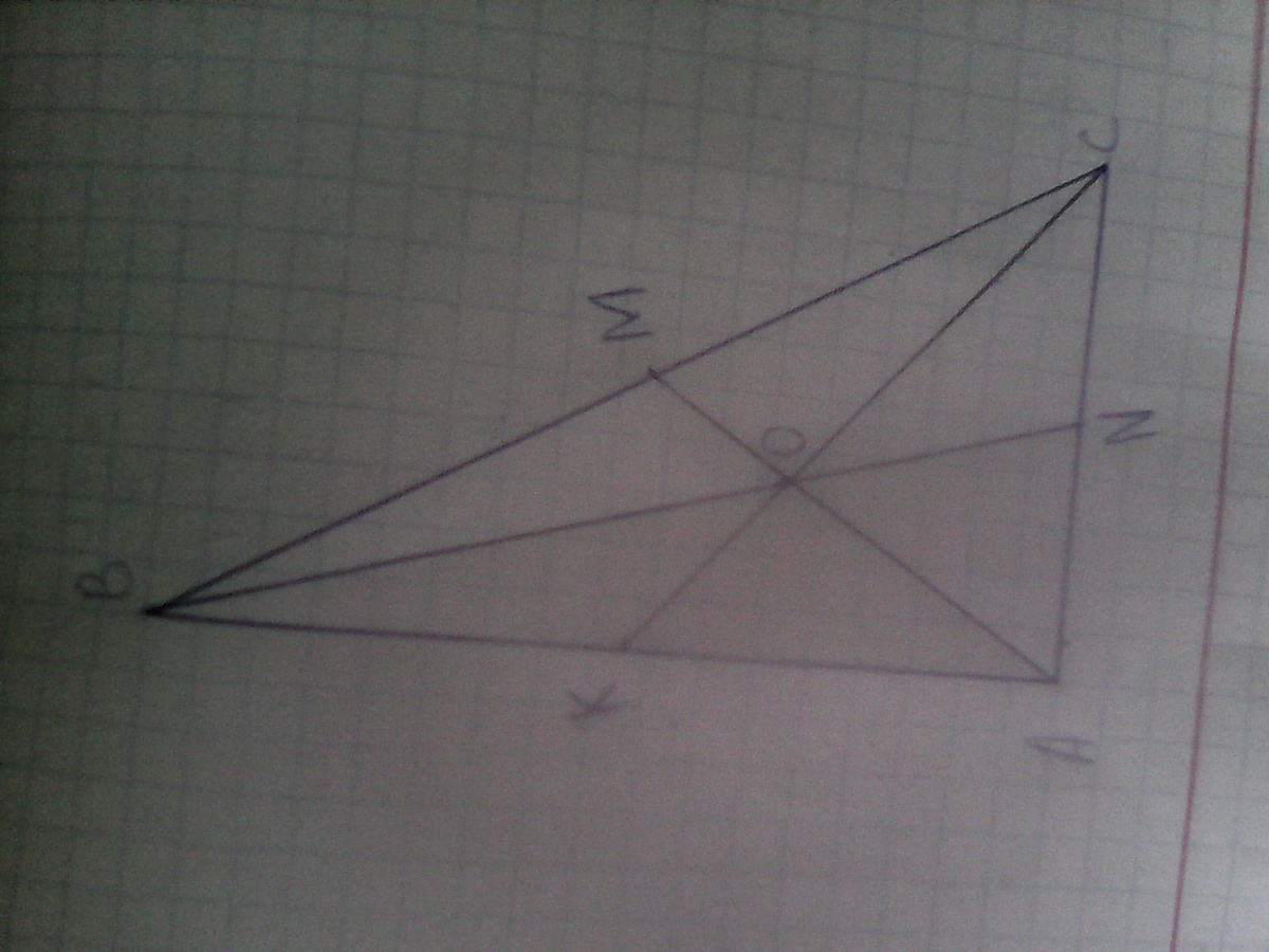 Находишь середины сторон треугольника(K, M, N), и проводишь прямые к противолежащим сторонам (C,A,B), точка пересечений этих прямых (О) является равноудаленной от сторон треугольника.