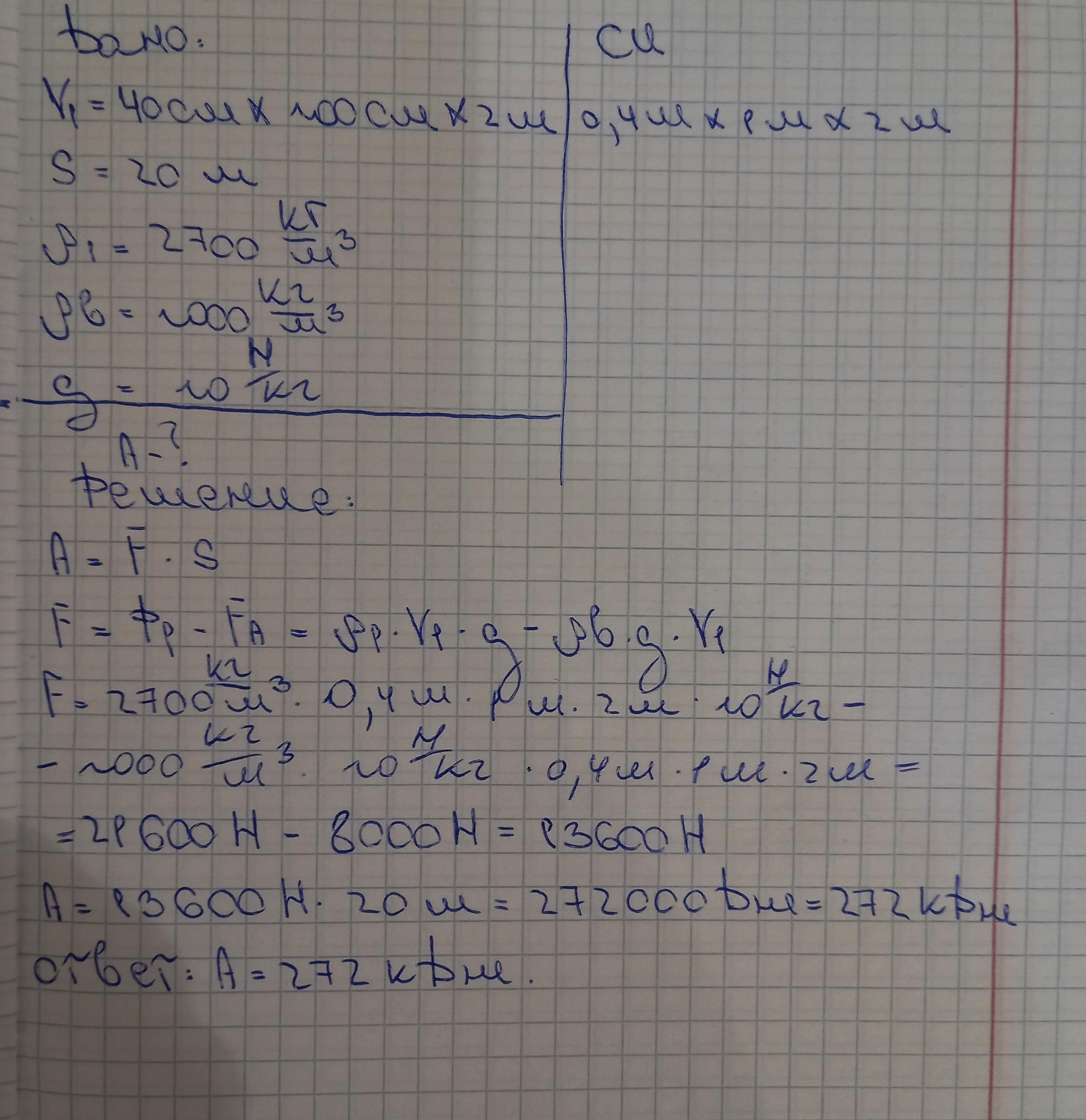 какая работа совершается при подъёме в воде алюминиевой плиты размером 40 см на 100 см на 2м на высоту 20 м?плотность алюминия равна 2700 кг/м3,плотность воды 1000кг/м3