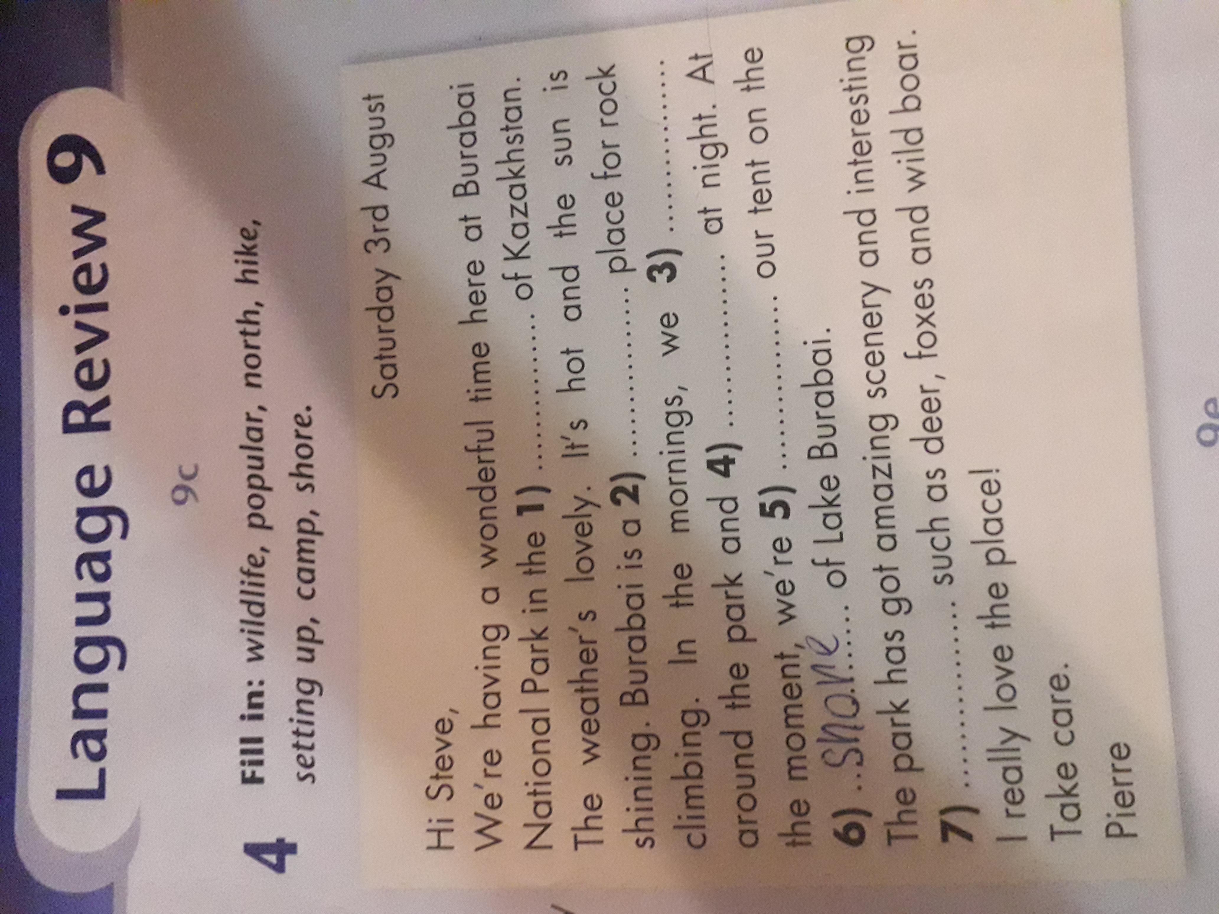 We’re having a wonderful time here at Burabai National Park in the 1) north of Kazakhstan. The 2) weather’s lovely. It’s hot and the sun is shining. Burabai is a 3) popular place for rock climbing. In the morning, we 4) hike around the 5) park and 6) camp at night. At the moment, we’re 7) setting up our tent on the 8)shore of Lake Burabai.