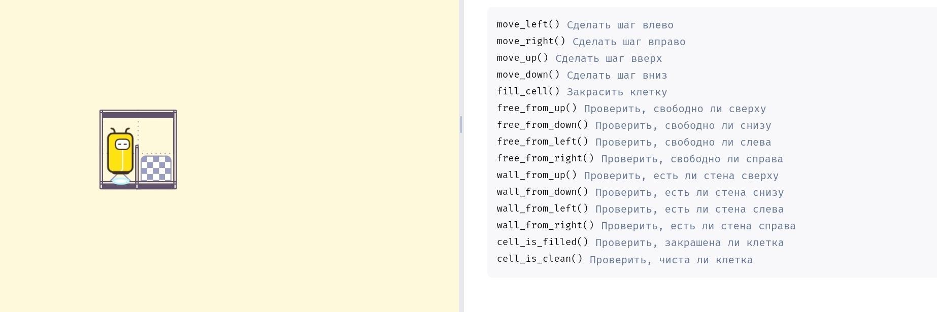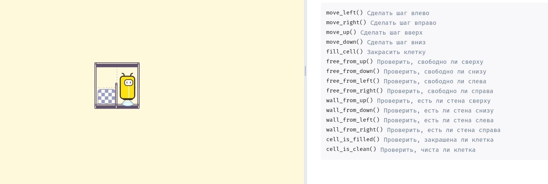 Робот находится в одной из двух нижних клеток квадрата 2×2. Между этими двумя нижними клетками есть стена, а других стен нет. Надо написать программу, которая переведёт робота в соседнюю нижнюю клетку квадрата.