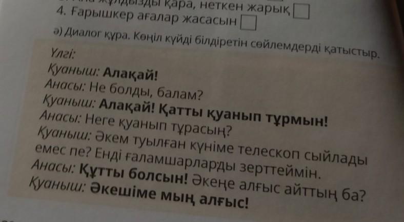 4 ә) Диалог құра. Көңіл күйді білдіретін сөйлемдерді қатыстыр. Үлгі: Қуаныш: Алақай! Анасы: Не болды, балам? Қуаныш: Алақай! Қатты қуанып тұрмын! Анасы: Неге қуанып тұрасың? Қуаныш: Әкем туылған күніме телескоп сыйлады емес пе? Енді ғаламшарларды зерттеймін. Анасы: Құтты болсын! Әкеңе алғыс айттың ба? Қуаныш: Әкешіме мың алғыс! надо сделать диалог по мативу этого диалога