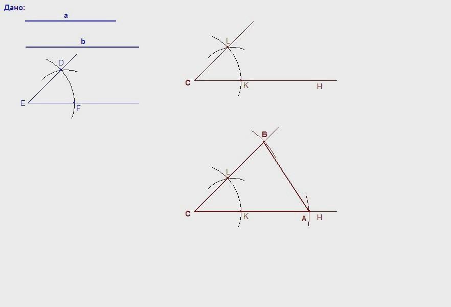 D и F - точки пересечения дуги со сторонами угла Е, К - точка пересечения дуги с лучом СН;