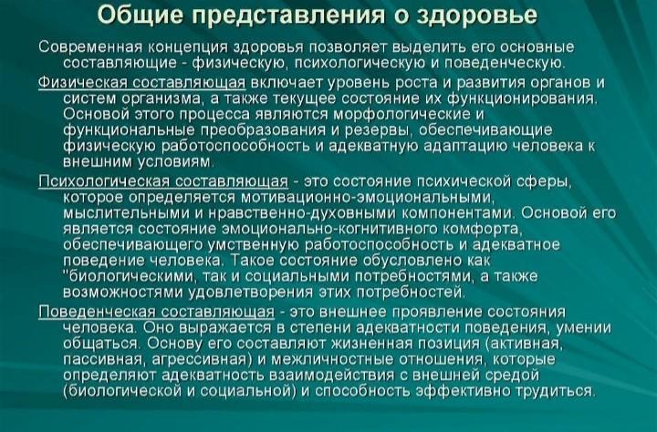 По определению специалистов Всемирной организации здравоохранения (ВОЗ), здоровье — это состояние полного физического, духовного и социального благополучия, а не только отсутствие болезни и физических дефектов. Современная концепция здоровья позволяет выделить его основные составляющие — физическую, психологическую и поведенческую.