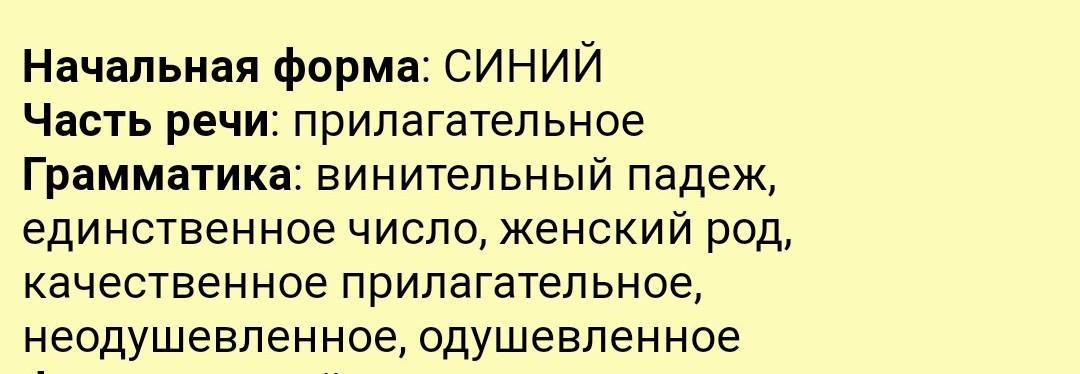 Часть речи слова синюю — имя прилагательное.Морфологические признакиНачальная форма: синий (именительный падеж единственного числа мужского рода);Постоянные признаки: качественное;Непостоянные признаки: единственное число, винительный падеж, женский род, полная форма.Синтаксическая роль