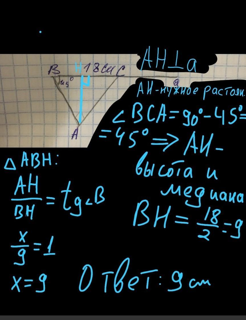 Помогите пожалуйста решить, Найти растояния от Точки А до прямой А. 18см 50 градусов.