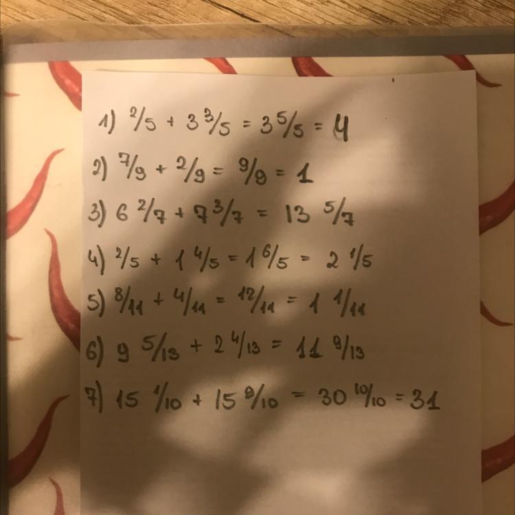 2\5+3 3\5; 7\9+2\9; 6 2\7+7 3\7; 2\5+1 4\5; 8\11+4\11; 9 5\13+2 4\13; 15 1\10 +15 9\10.